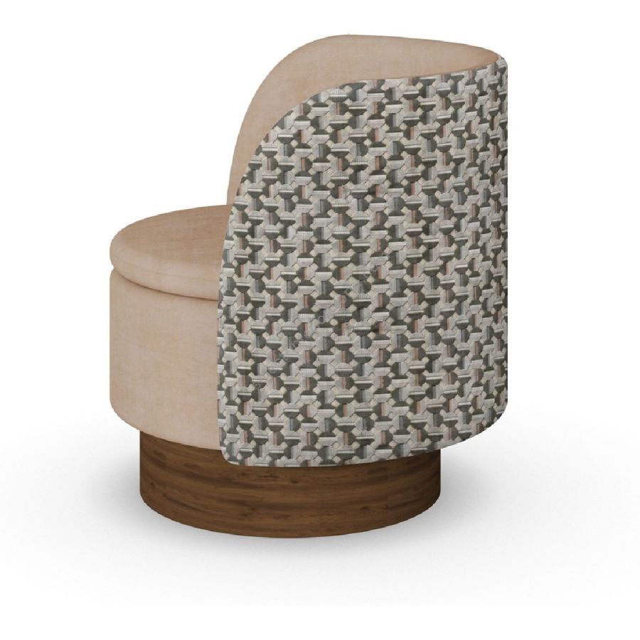 The Carrie Armchair features a plush seat upholstered in a soft, beige fabric that offers a warm and inviting feel. The back and sides of the chair are adorned with a distinctive patterned fabric, creating a unique visual contrast and adding texture to its sleek silhouette. The chair is supported by a robust walnut base that adds a natural element and ensures durability.