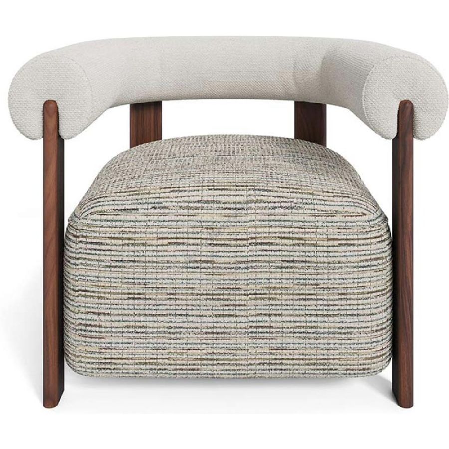 Supported by sturdy walnut legs, the Claire Armchair boasts both stability and a natural aesthetic. The rich, dark wood complements the neutral tones of the upholstery, enhancing the chair’s overall elegance. The open design and curved lines of the armchair provide a contemporary touch, making it a perfect fit for modern interiors.