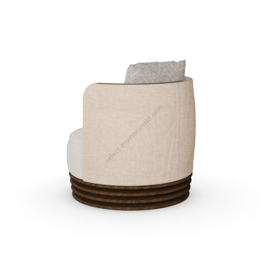 The Dawn Armchair features a plush, circular seat upholstered in a soft, cream fabric that provides a welcoming and cozy feel. The backrest and sides are elegantly covered in a complementary beige fabric, creating a sophisticated contrast. A decorative patterned cushion enhances the chair’s comfort and visual interest.