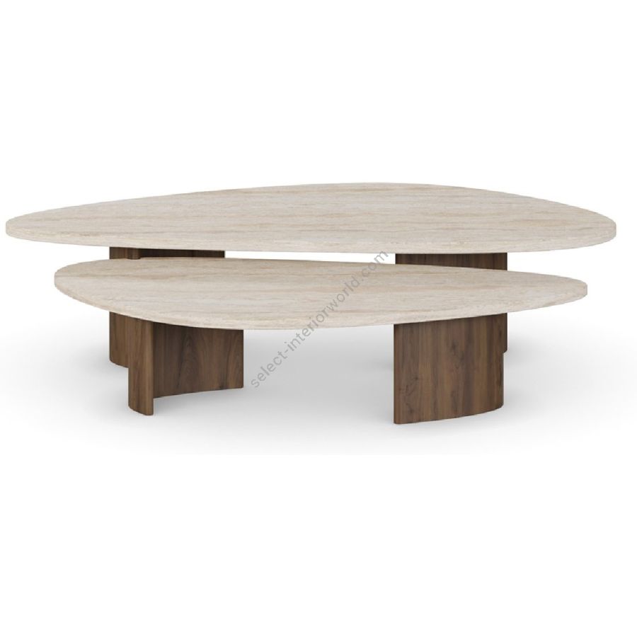 Agnes Coffee Table, a sophisticated fusion of natural travertine and rich walnut. This elegant table features a unique, dual-surface design that provides both aesthetic appeal and functional versatility. The smooth travertine tops rest gracefully on sturdy walnut bases, showcasing the harmonious blend of materials. Perfect for contemporary and classic interiors alike, the Agnes Coffee Table is a timeless addition to your living space.