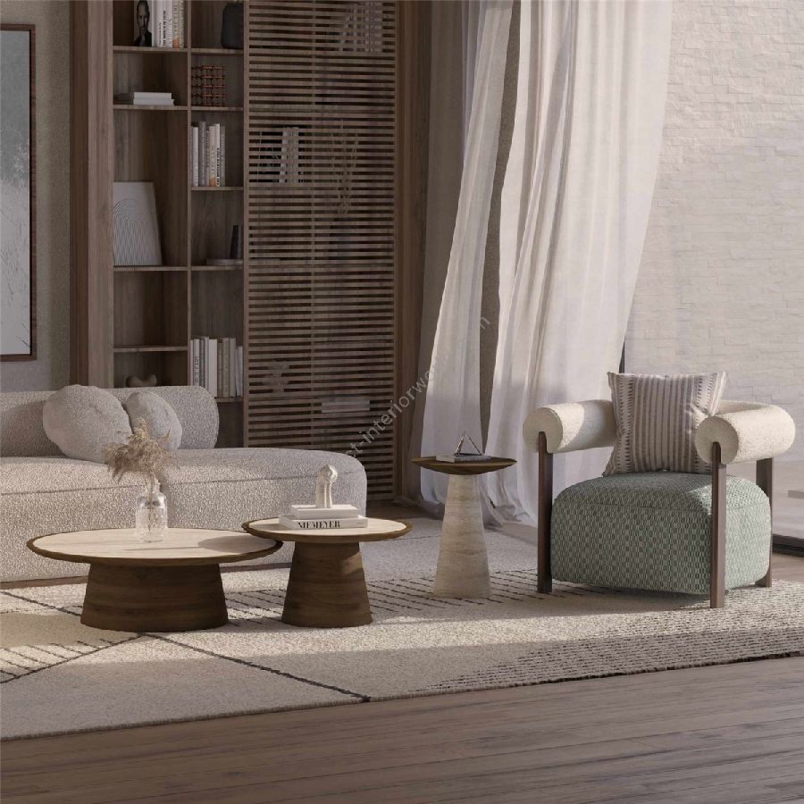 The travertine tops showcase unique natural veining, ensuring each table is a one-of-a-kind piece. The walnut matte bases provide a sturdy foundation and add a touch of natural elegance to the overall design. Whether used together or separately, the Liz coffee table set enhances your living room with its timeless beauty and practical versatility.