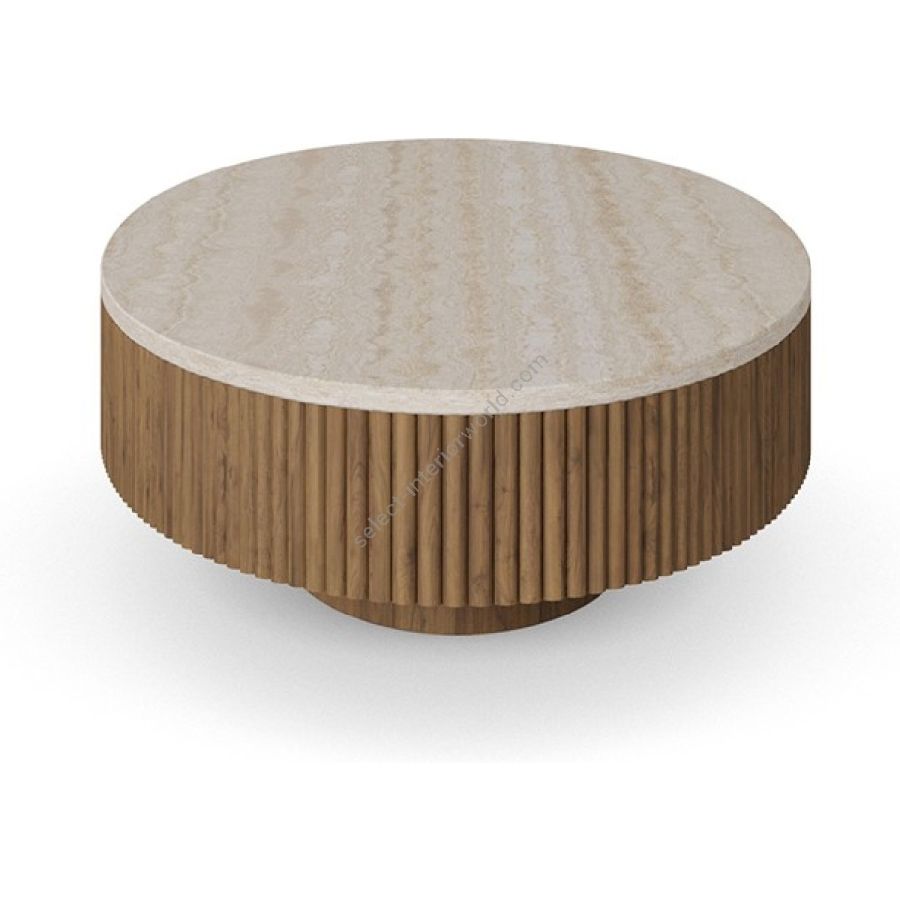 The base of the table is constructed from ribbed walnut, adding a distinctive texture and visual interest to the piece. The ribbed detailing around the base contrasts elegantly with the smooth travertine top, creating a harmonious balance of materials. The warm tones of the walnut further complement the natural stone, making this coffee table a versatile addition to both modern and traditional interiors.