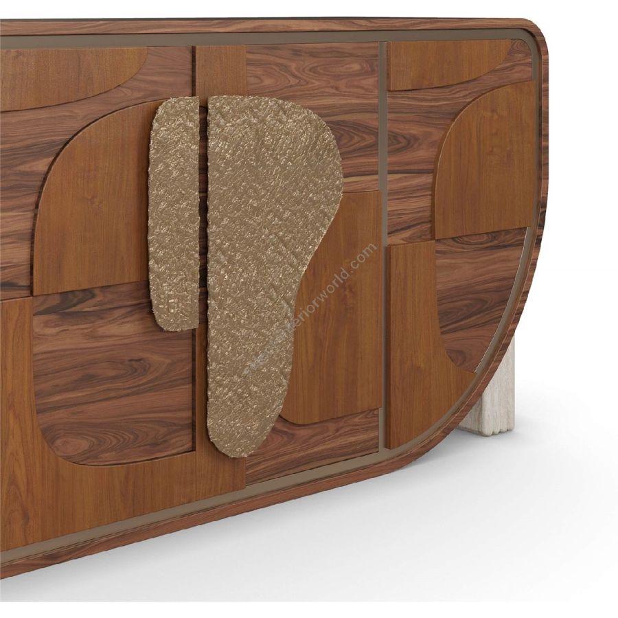 The Aurore sideboard is a true celebration of organic materials and bold design. Featuring a rich combination of walnut and cherry wood, its curved silhouette is accentuated by intricate wood paneling that creates a striking visual rhythm. The hammered brass handles, with their unique texture, add a sense of refinement, while the ribbed travertine legs provide a solid yet elegant foundation. Perfect for those who appreciate artistry and craftsmanship, the Aurore sideboard will instantly become the focal point of any space, adding a touch of modern luxury.
