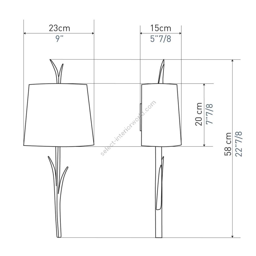 Width: 23 cm, Projection: 15 cm, Maximum: 2 x 40 w, Les Abat-jours peuvent être fabriqués dans 18 coloris au choix, The colour for the shades can be chosen out to 18 different hues