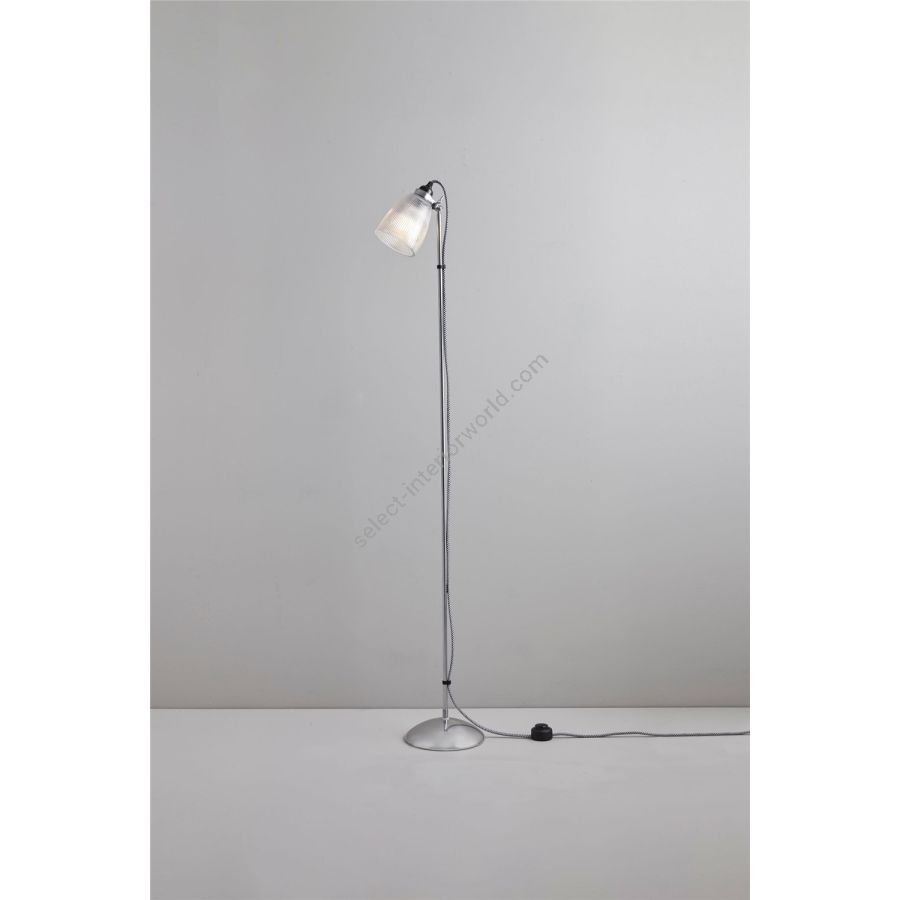 Our Primo Floor Light features a unique black & white cotton braided cable, sleek chrome arm and base, and an intricate glass prismatic shade that gently diffuses light. Also available as a table light.