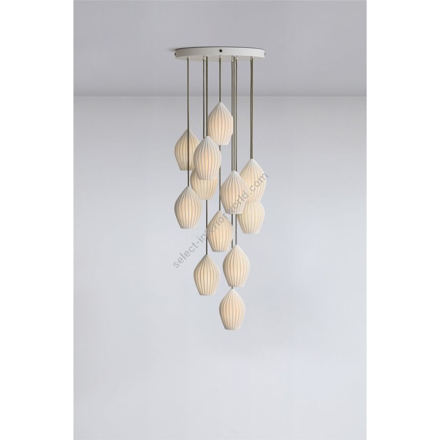 The Fin Grouping brings spectacular impact to one of our most beloved designs. Featuring 12 or 18 individual pendants, this dramatic composition transforms stairways, hallways, receptions and larger living areas. The intricate handmade bone china shades emit a generous downward light while glowing beautifully themselves to enrich the atmosphere of the room.
