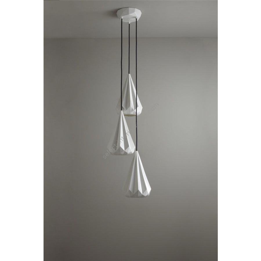 The Hatton 3 Grouping of Three Pendant is a truly iconic statement piece. Using a highly skilled process, we have been able to transform the bone china shade into an intricate, multi-faceted, gem-like form. When switched 'off' the pendant has an angular sculptural beauty, and when 'on' it provides warm illumination with dramatic lines and shadows.