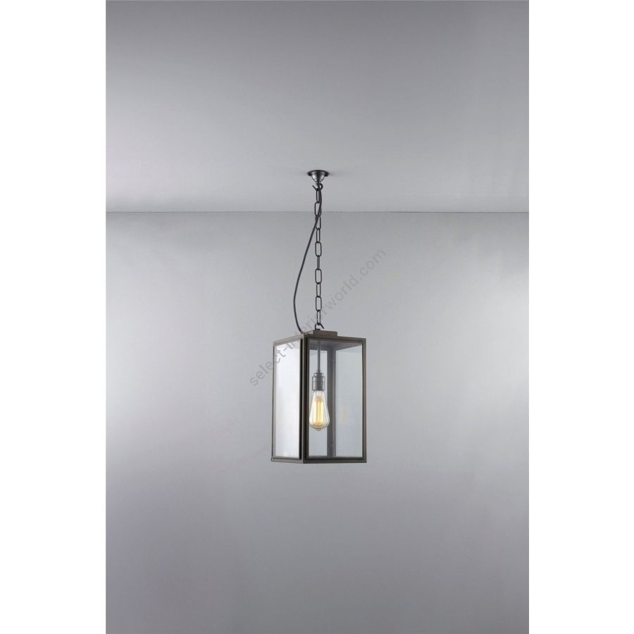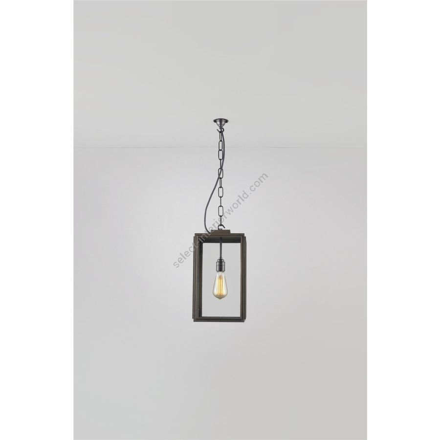 Exterior Square Pendant in weathered brass, externally glazed and available in three sizes. Suspended on a weathered brass hook 1.5 meters of chain. Glass on four sides, with a closed top for exterior use.