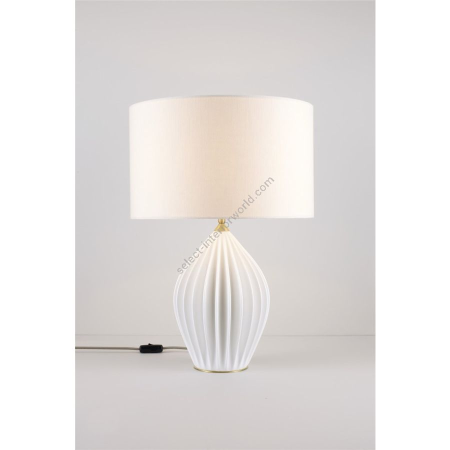 The Fin King Table Light marks a new direction for Original BTC, combining our trademark bone china with the addition of a drum shade. The ivory linen shade casts a soft, diffused light, creating beautiful shadows on the intricate hand slip-cast base. The Fin is finished with lacquered, brushed solid brass details and signature cotton braided cable in a pale grey, while the shade sits on an angleable ball and socket to facilitate reading.