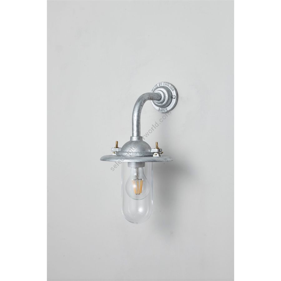 An Exterior Bracket Light with a heavy cast reflector that's held by brass wing nuts and bolts for easier access to the lamp. This industrial wall light is available in either galvanised cast iron or sandblasted bronze, with a canted or right angle arm. Glass is clear or frosted.