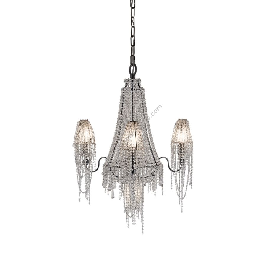 The strings of crystals are exclusively transparent and enriched by irregular elements of different shapes. A coup de theatre of great effect.