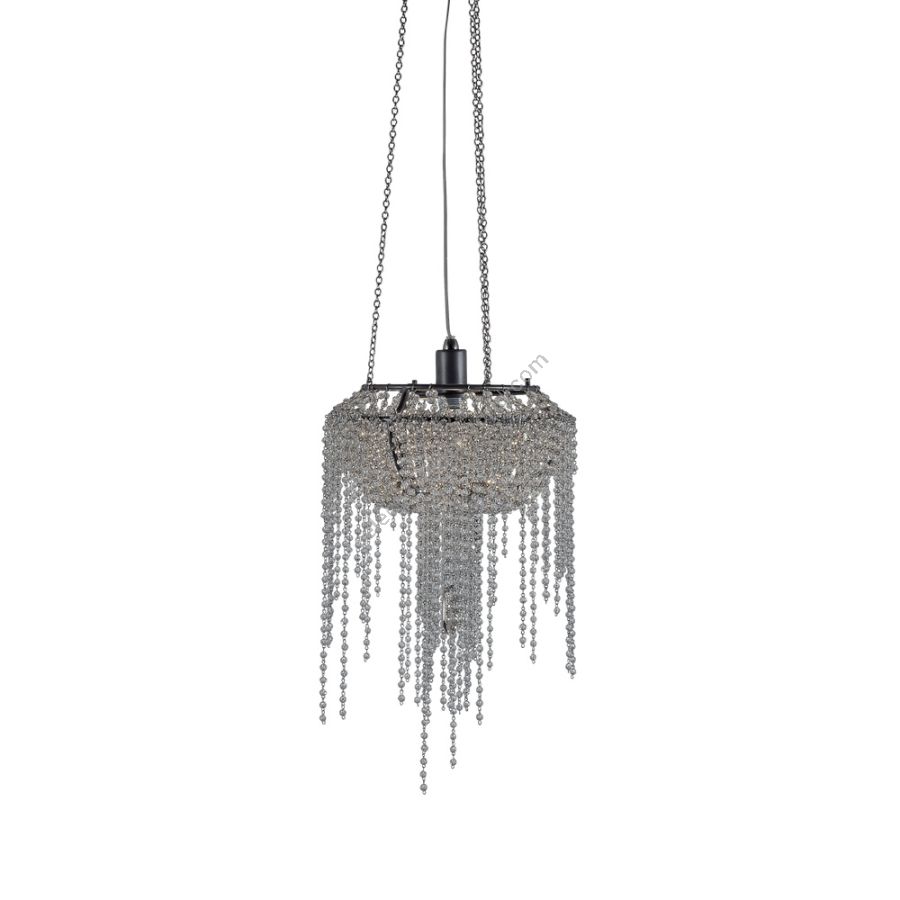 The strings of crystals are exclusively transparent and enriched by irregular elements of different shapes. A coup de theatre of great effect.