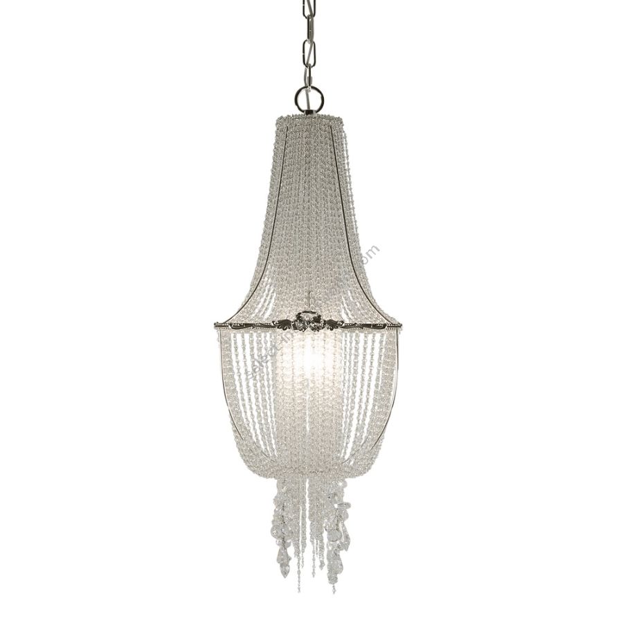 The strings of crystals are exclusively transparent and enriched by irregular elements of different shapes. A coup de theatre of great effect.