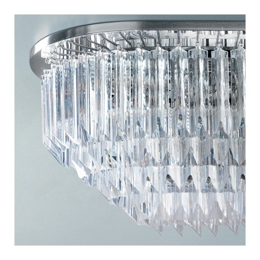 Ceiling lamp with crystal trihedrals or trihedrals and quadrihedrals in murano glass, available in many colours and a frame in 24 karat polished gold or chrome.
