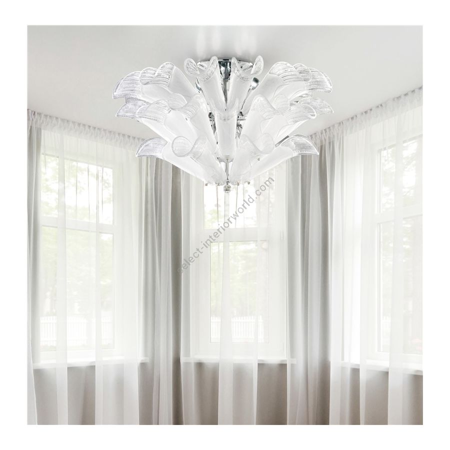 Ceiling light with a floral design with petals in fine murano glass in different colours. Polished chrome or 24-karat gold frame