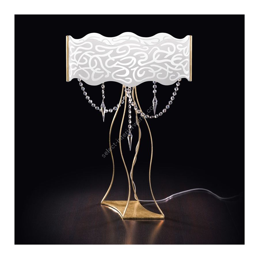 Table lamp in milk white engraved curved glass, frame with gold or silver leaf and pendants in swarovski crystal.