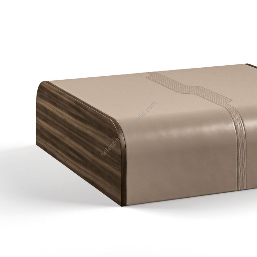Coffee table with wooden structure and leather top. Side elements in eucalyptus veneered plywood. Central element made of curved plywood covered in smooth and printed leather.