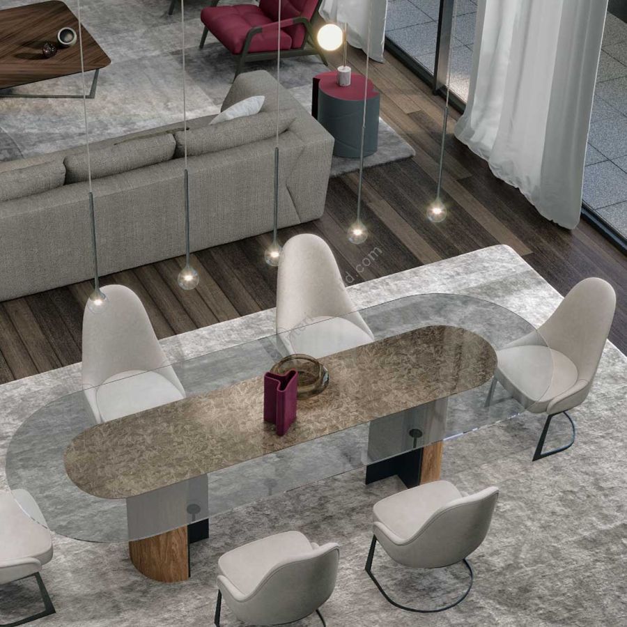 Dining table Admiral with bases in curved black walnut veneered poplar plywood and flat part in MDF coated poplar plywood with lacquered finish. Painted metal insert. Transparent glass top with painted central part.