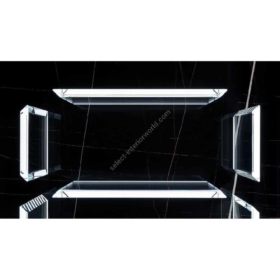 Luminous bookcase made up of a panel in MarmoReflex or LegnoReflex and backlit glass shelves with a prismatic shape. Possibility of having stainless steel bottle holders to transform the luminous bookcase into a wine cellar.