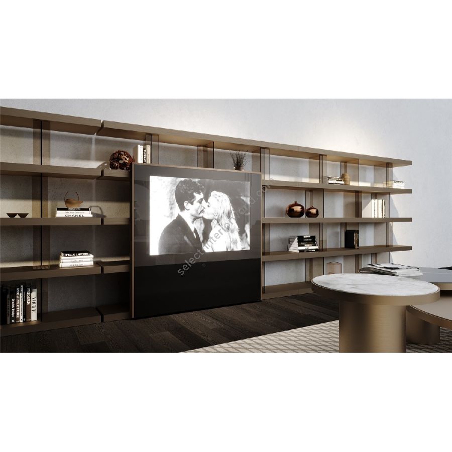 Modular interlocking bookcase with smoked glass or bronze glass partitions th. 10mm and wooden shelves in Bronze finish or in satin metal finishes. Sliding door/TV container in Dark grey glass. Metal frame in bronze (100M) finish. Speaker's band in black lycra.
