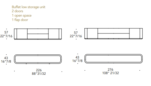Buffet with wooden structure. Doors with push-pull opening. Sides covered with leather. Top in Marble glass with profile in satin brass finish. Intnal shelves in glass. 2 doors, 1 flap, 1 open space Sides in leather CAT.C, NABUK or COLORATA with quilting* Noce Canaletto, Canaletto Hennè, Rovere Beluga or shiny lacquered.