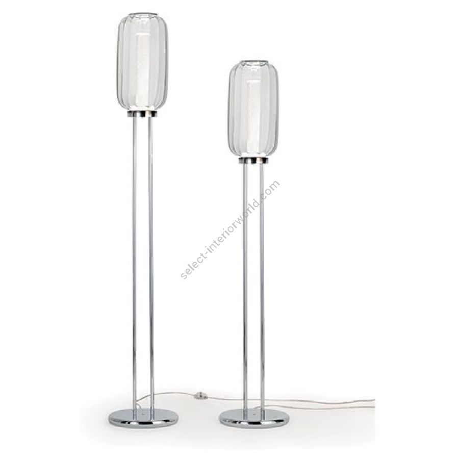 Floor lamp in artistic glass in the colours: transparent, acquamarine, straw-yellow. Inner shade in Rugiana finish glass and magnetic glass cover. Base and stems in polished chromed metal. Led lighting with 3W GUA spot and 2W Strip