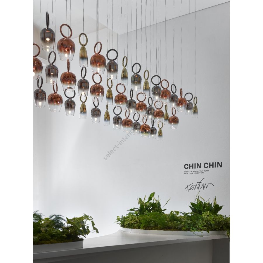 Exquisite design that plays with your perceptions. The CHIN CHIN collection is formed of crystal components shaped into golden drinks glasses, available in three playful designs – red wine, white wine, and champagne. Each piece is suspended from a flawless glass ring and finished with gradient nanocoating. The effect is a perfect paradox. The glasses look full but they are empty, they hang upside down but nothing spills. This design is both opulent and contemporary, creating a dramatic focal point for your interior.