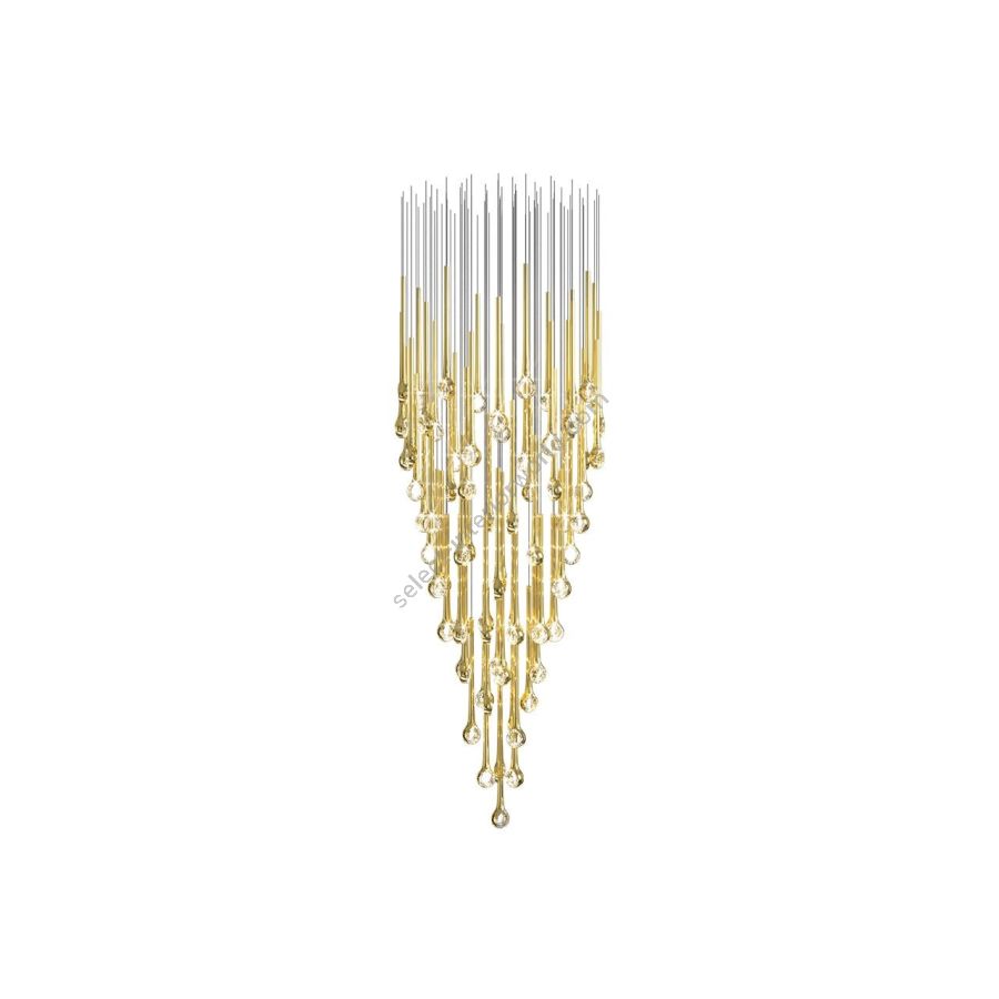 The Eyelet collection creates a striking visual with its sleek, elongated forms suspended from the ceiling, resembling polished needles. Each piece is enhanced with metal nanocoating, giving it a reflective finish, that captures and refracts light, adding an interplay of shimmer and depth.