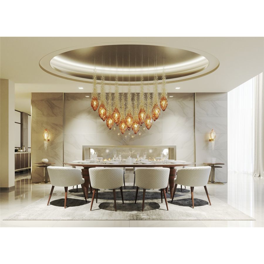 Capturing the beauty of a comet streaking through the night, the Flash collection features handblown crystal gems, each followed by a tail of glittering beads. Cascading downward, they create a bold installation that fills any interior with vibrant light and movement.