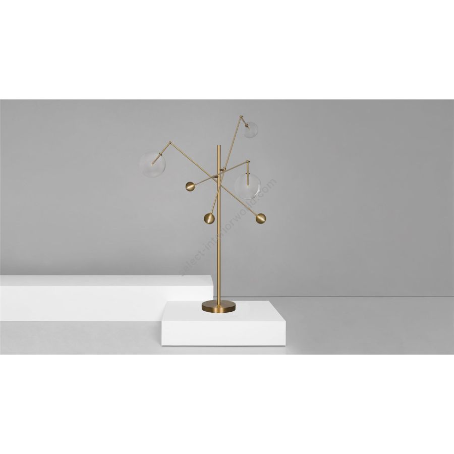 Three mouth-blown spheres upon cantilevered arms create an adjustable interplay of geometric angles. A free-standing lamp with a striking modular form, derived from the dynamic balance between illuminated glass globes and brass counterweights.