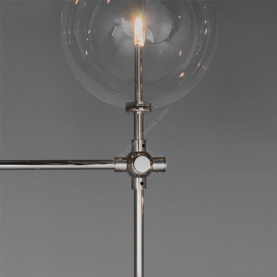 An array of ethereal glass globes floats weightlessly around a free-standing geometric lattice. The mouth-blown spheres are positioned rotationally around the right-angled brass grid, a spatial design creating an architectural impression.