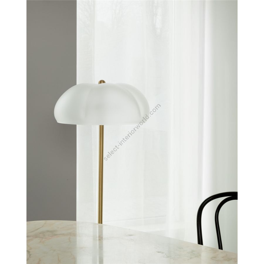 Drawing inspiration from the essence of nature, this exquisite milk-frosted glass cloche, paired with a brass structure, is crowned with a matching, subtle button. Mirrored at the base, it seamlessly serves as a dimmer, inviting one to sculpt the perfect glow.