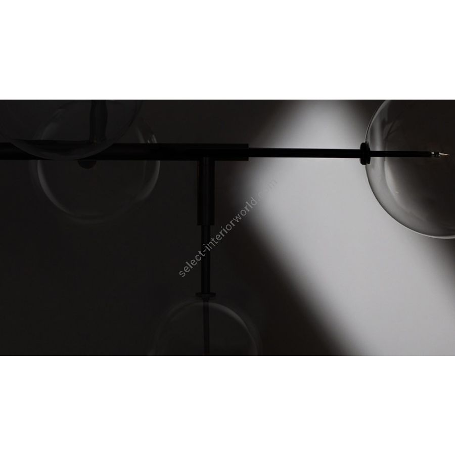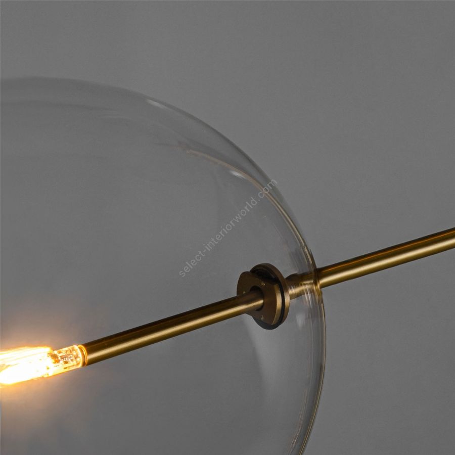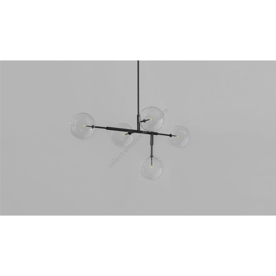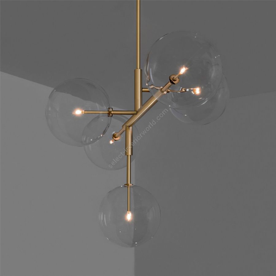 Five glass globes act as illuminated nodes upon a linear brass frame. A striking asymmetric geometry of clean right angles creates a contemporary fixture, a streamlined voyage.