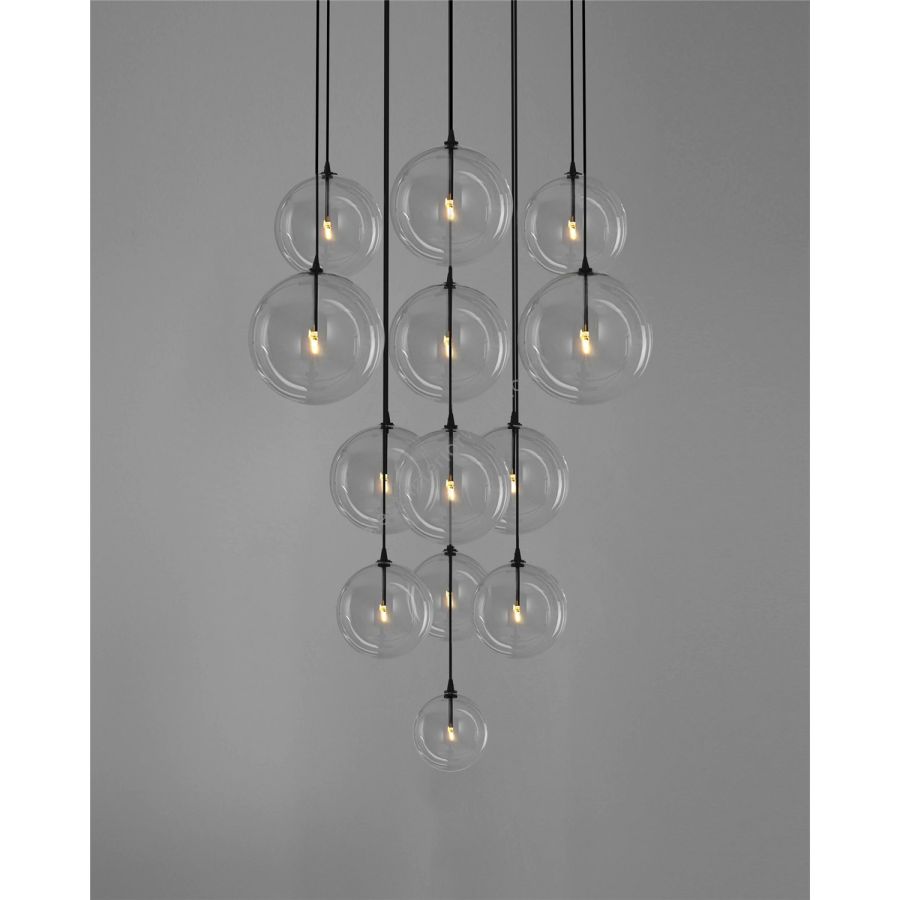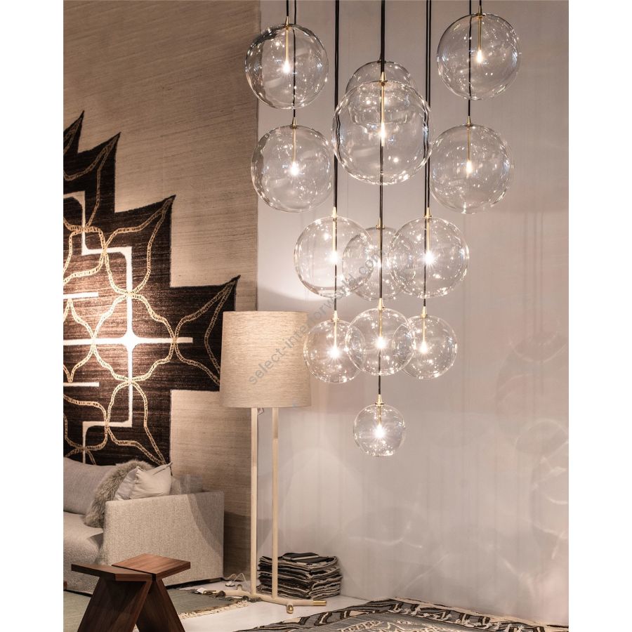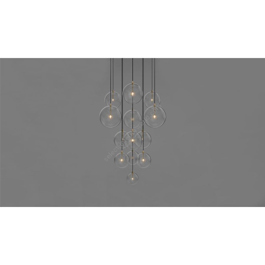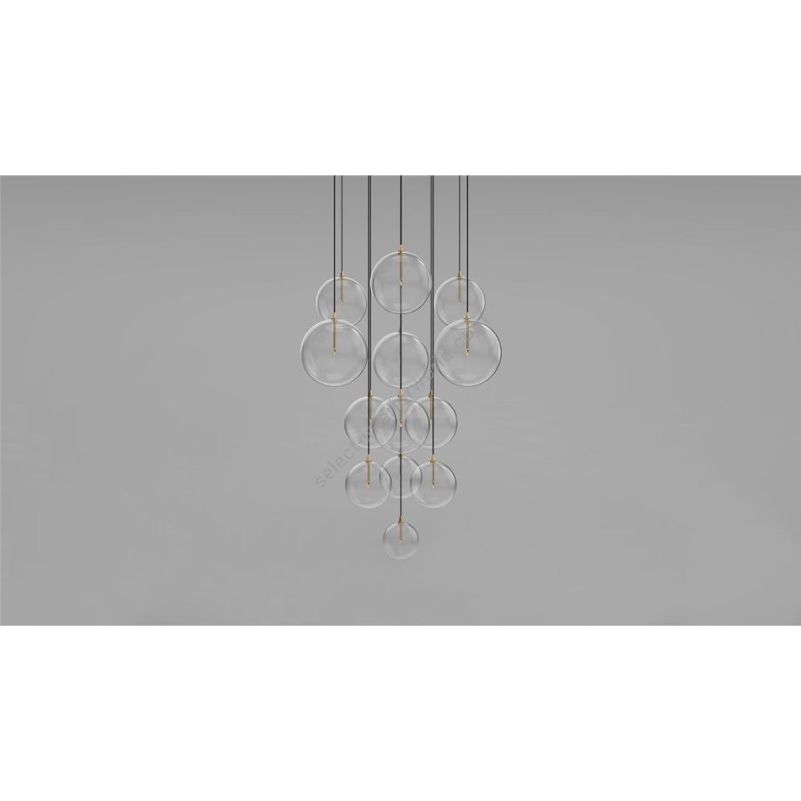 An arrangement of thirteen glass globes suspended from a discus of brass forms a serene ceiling constellation. A range of diameters creates the impression of a flock of spontaneous soap bubbles, floating in pyramidal formation in the air.