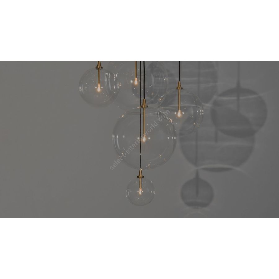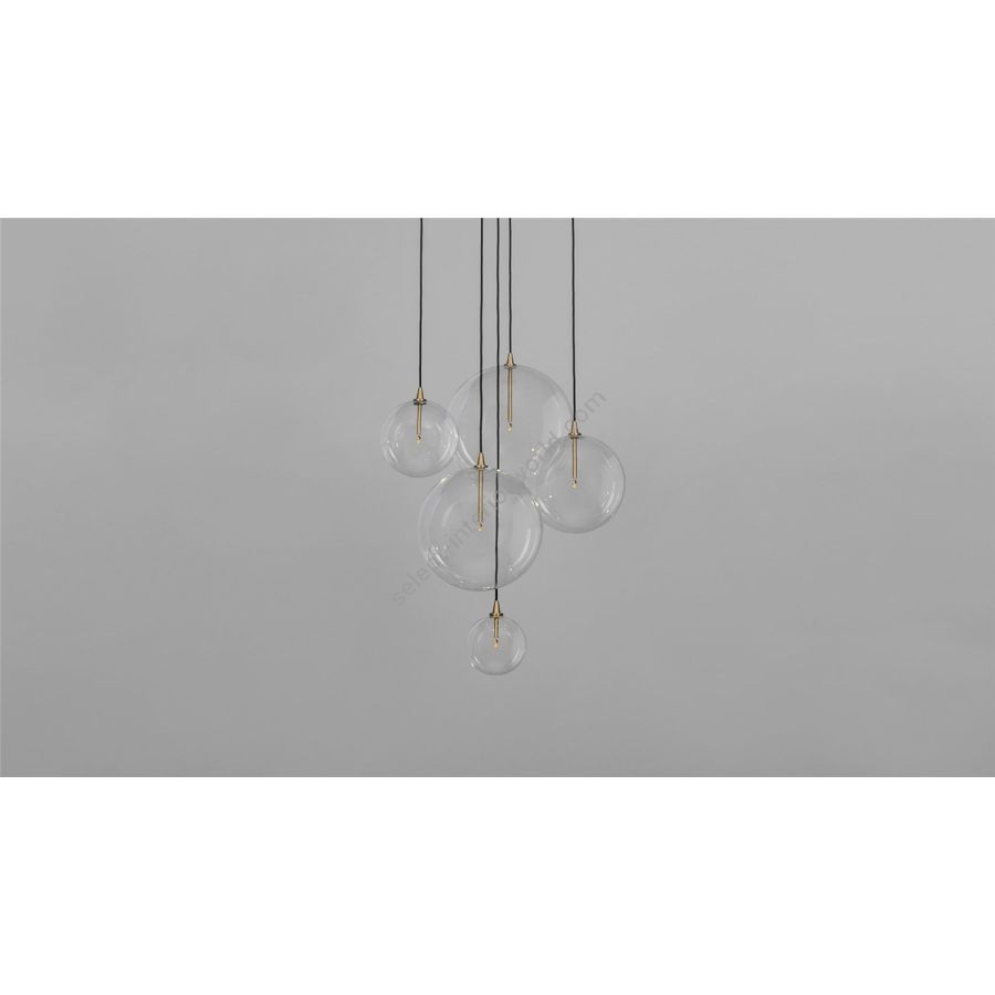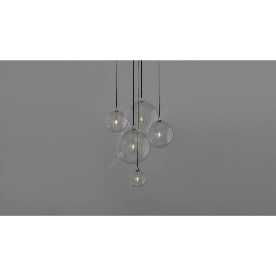An arrangement of five glass globes suspended from a discus of brass forms a serene ceiling constellation. A range of diameters creates the impression of a flock of spontaneous soap bubbles, floating weightlessly in the air.