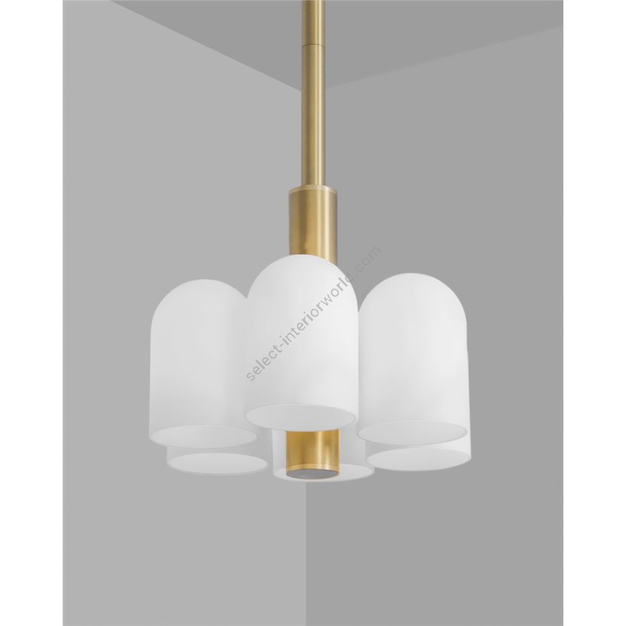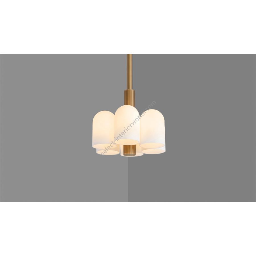 Influenced by the fashions of the future, in large and small scale. A honeycomb structure of six glass shades suggests stored energy. Gracefully suspended with a central brass shaft, the structure echoing its potential.