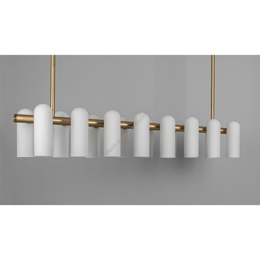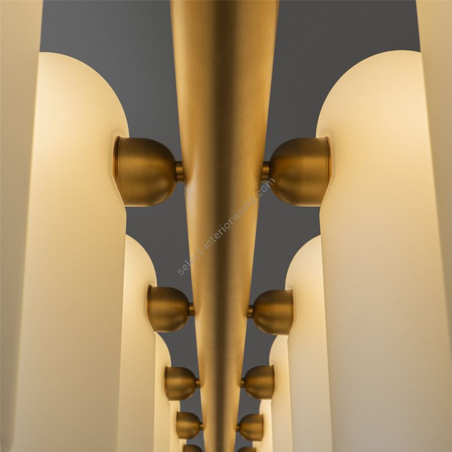 A colonnade of light sources. This delicate engine of frosted glass generates a luminous environment while contrasting brass elements create a sense of stability.