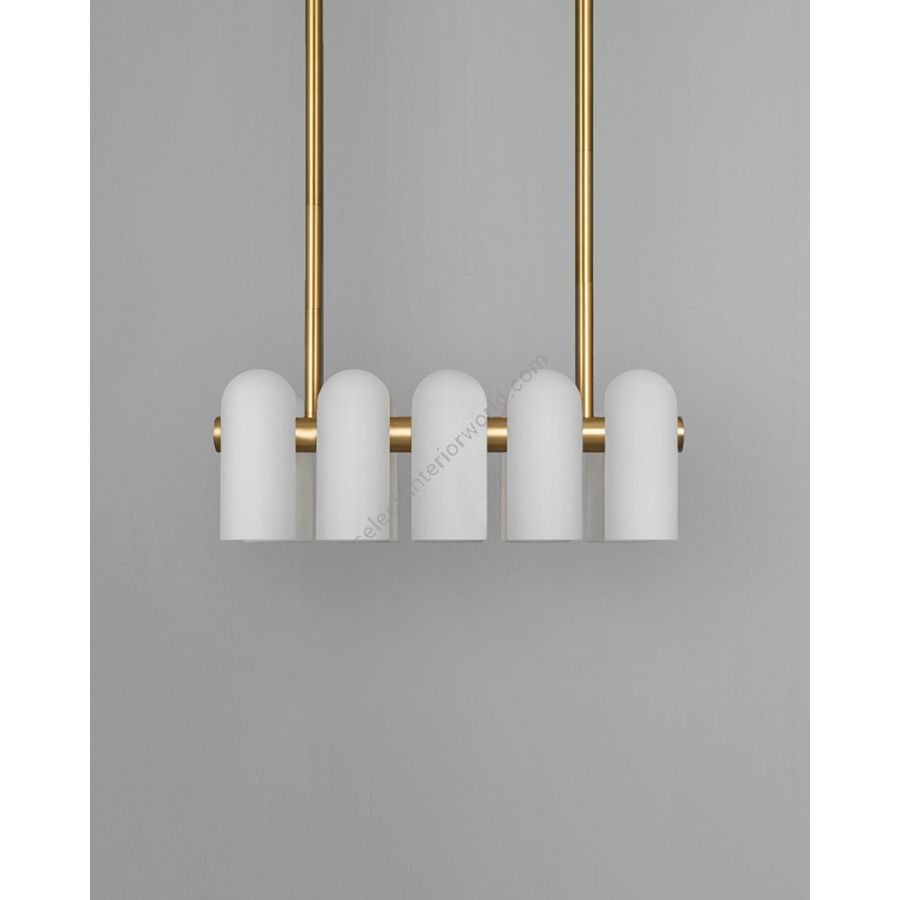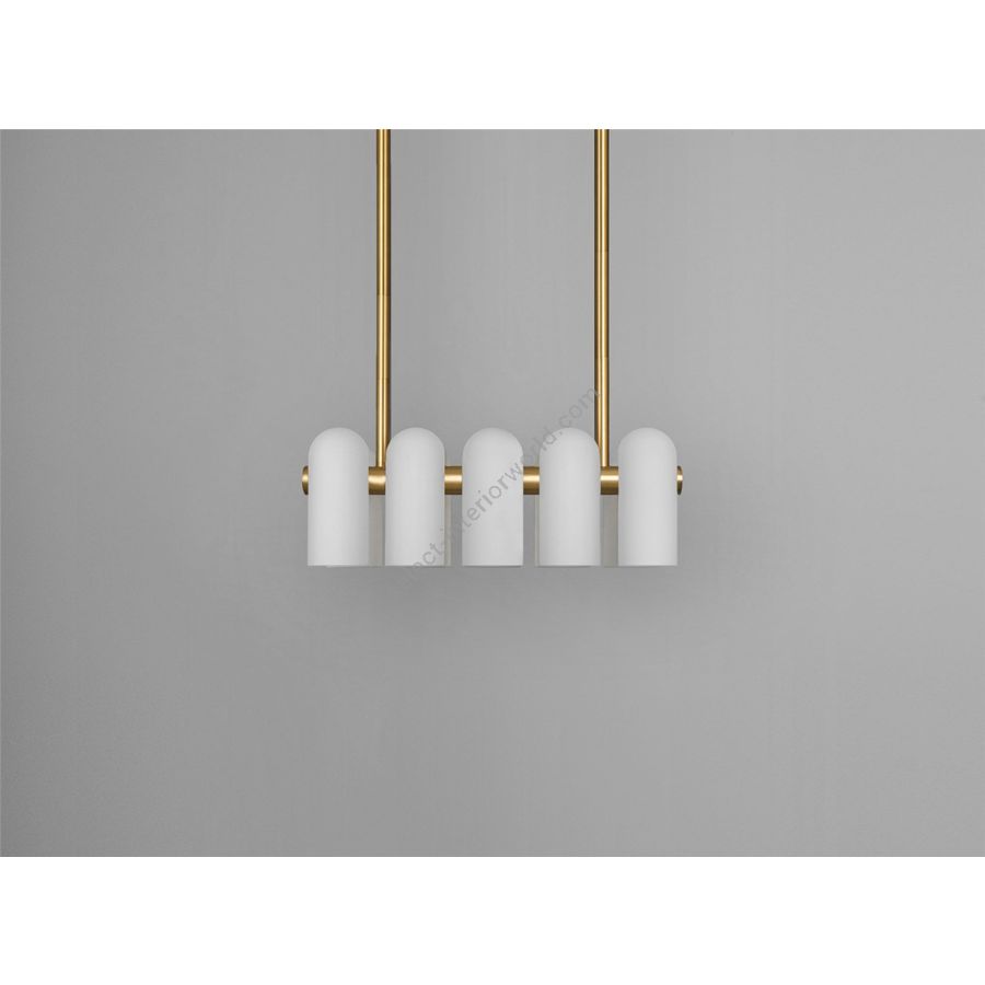 A colonnade of light sources. This delicate engine of frosted glass generates a luminous environment while contrasting brass elements create a sense of stability.