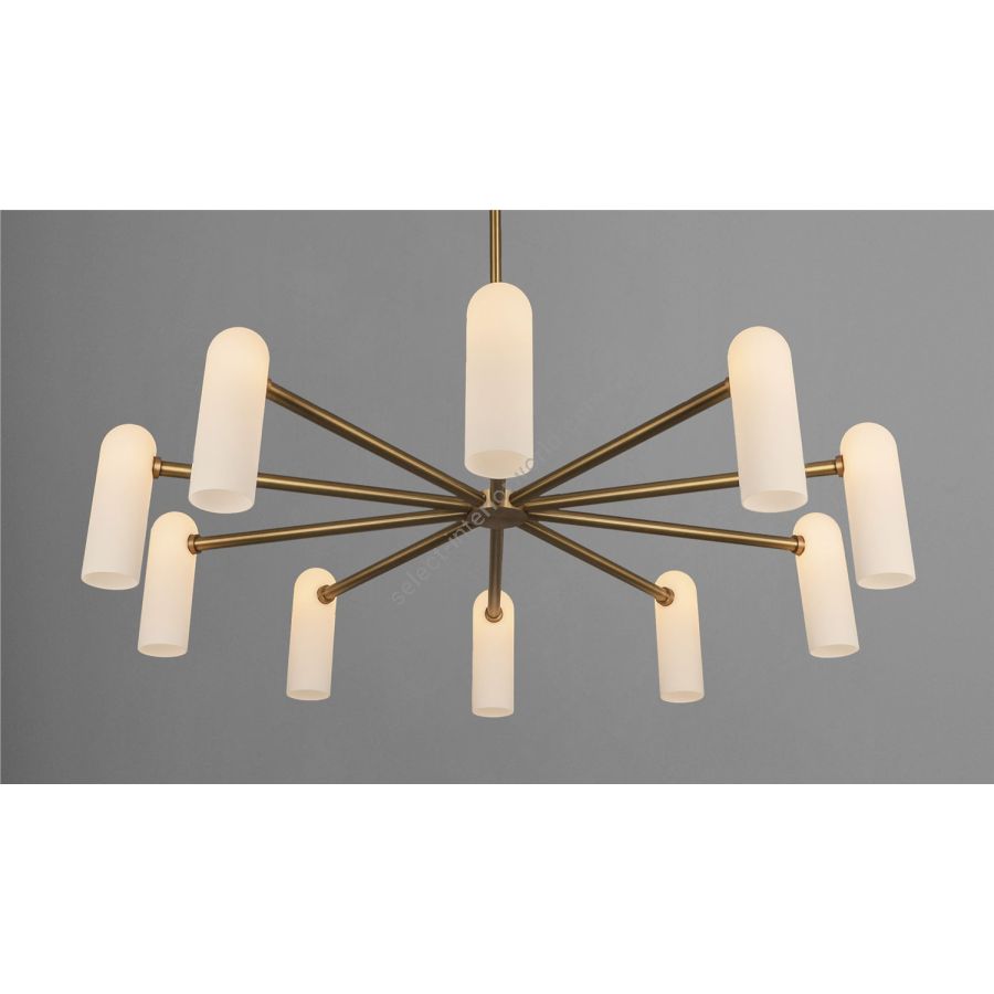 Spokes of brass hold slender lampshades, the circle of light creating a planetary effect in this striking round chandelier. Arched shapes drape downward while emanating an atmospheric twinkle.