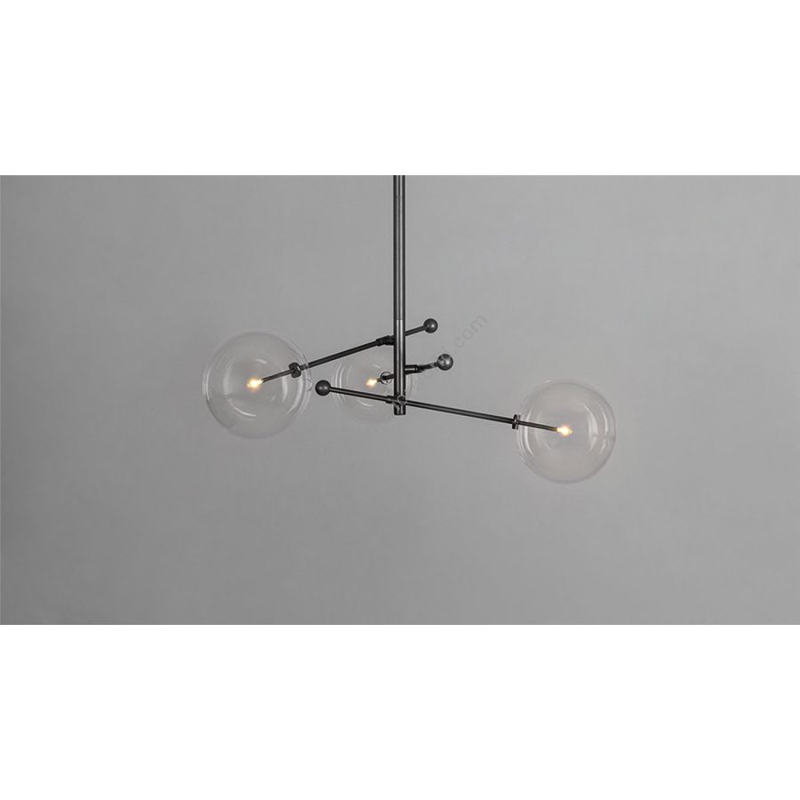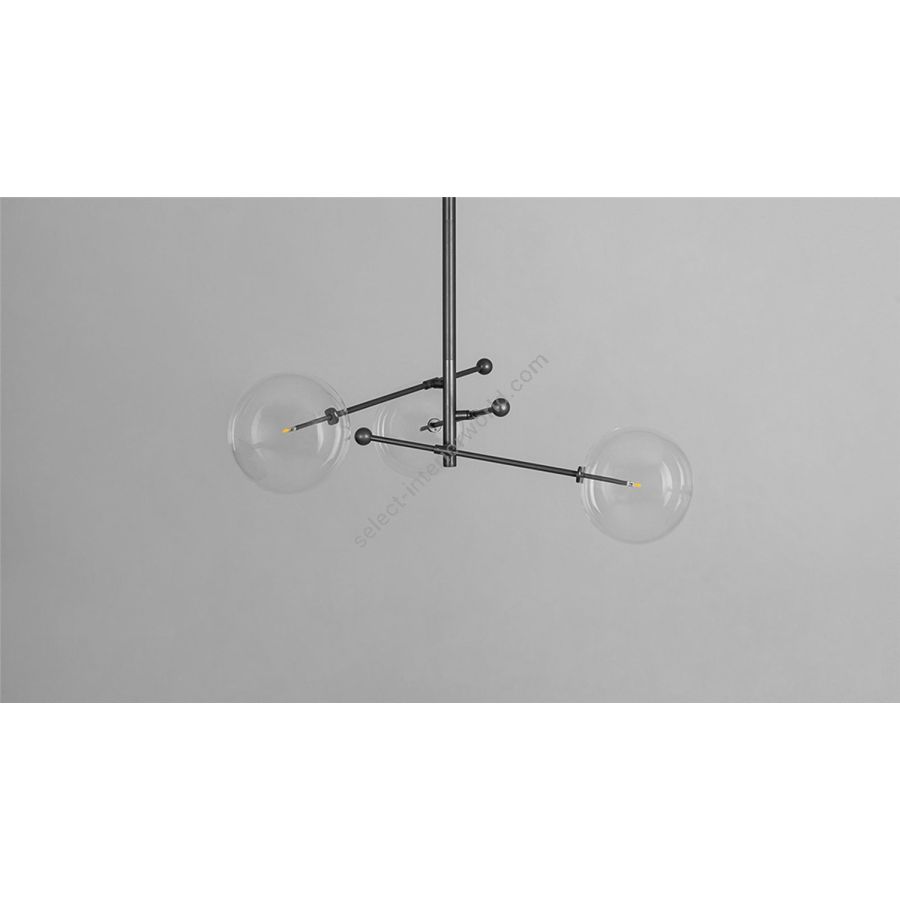 A trio of mouth-blown glass globes orbit a central axis, poised on adjustable cantilevered brass arms. The modular asymmetry of the intersecting angles forms a gyroscopic composition, bringing an interstellar elegance to a space.