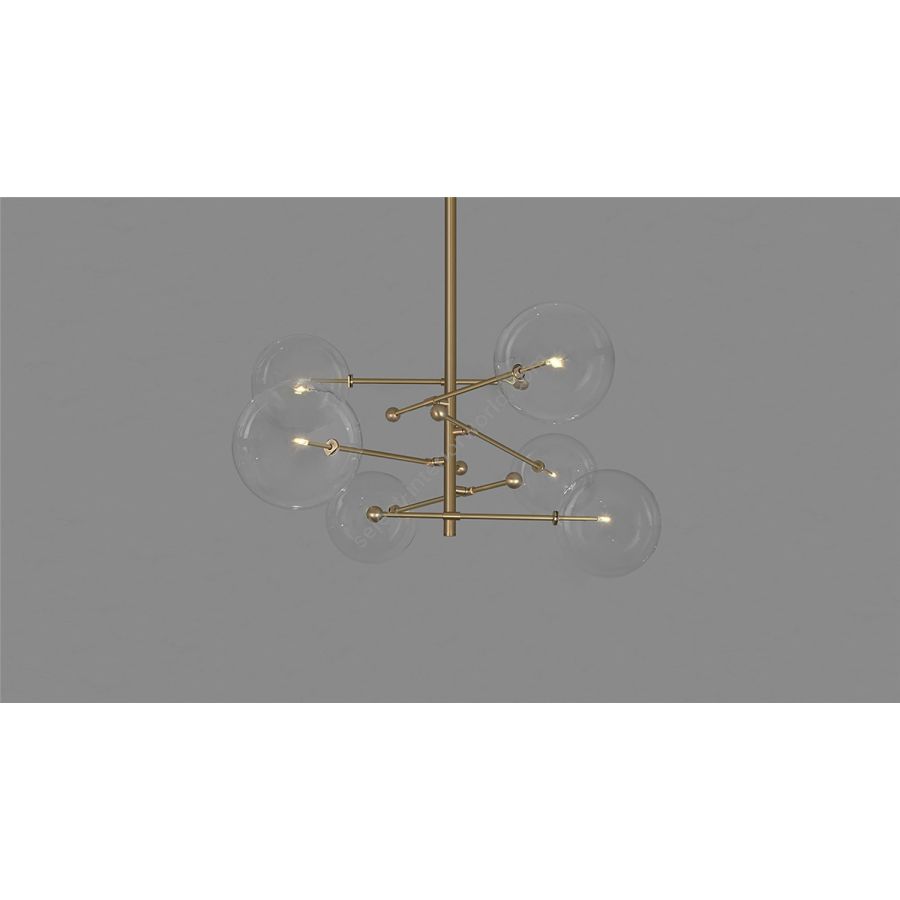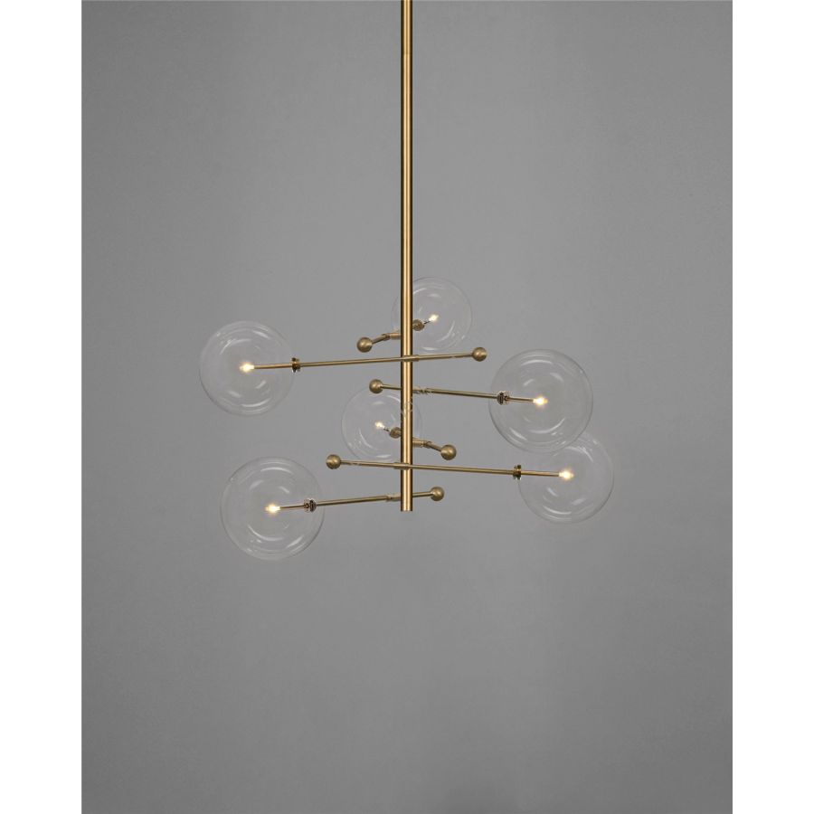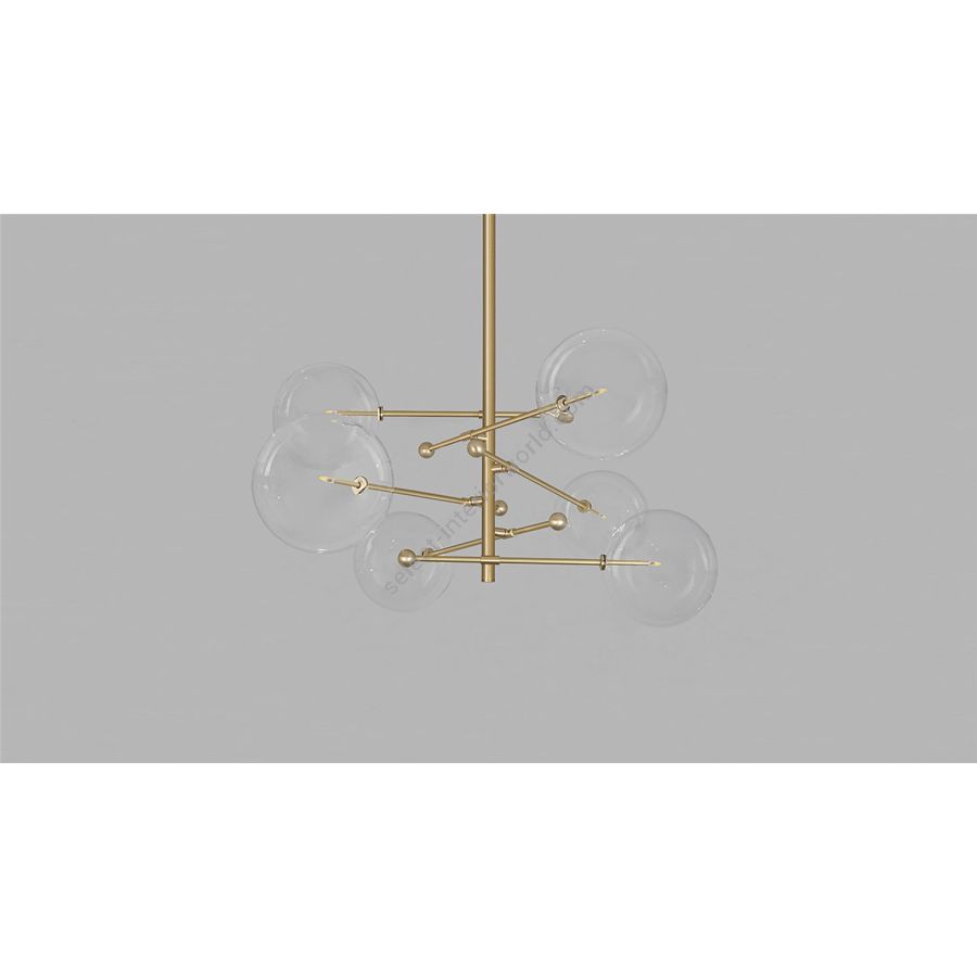 A sextet of mouth-blown glass globes orbits a central axis, poised on adjustable cantilevered brass arms. The modular asymmetry of the intersecting angles forms a gyroscopic composition, bringing an interstellar elegance to a space.