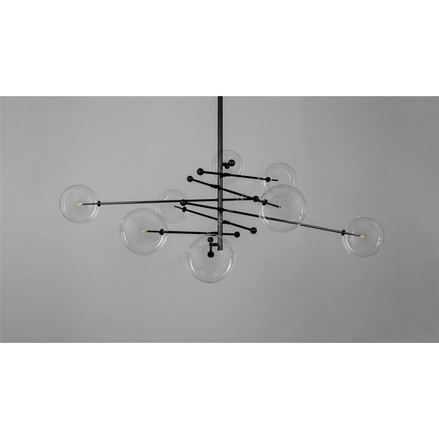 An octet of mouth-blown glass globes orbit a central axis, poised on adjustable cantilevered brass arms. The modular asymmetry of the intersecting angles forms a gyroscopic composition, bringing an interstellar elegance to a space.