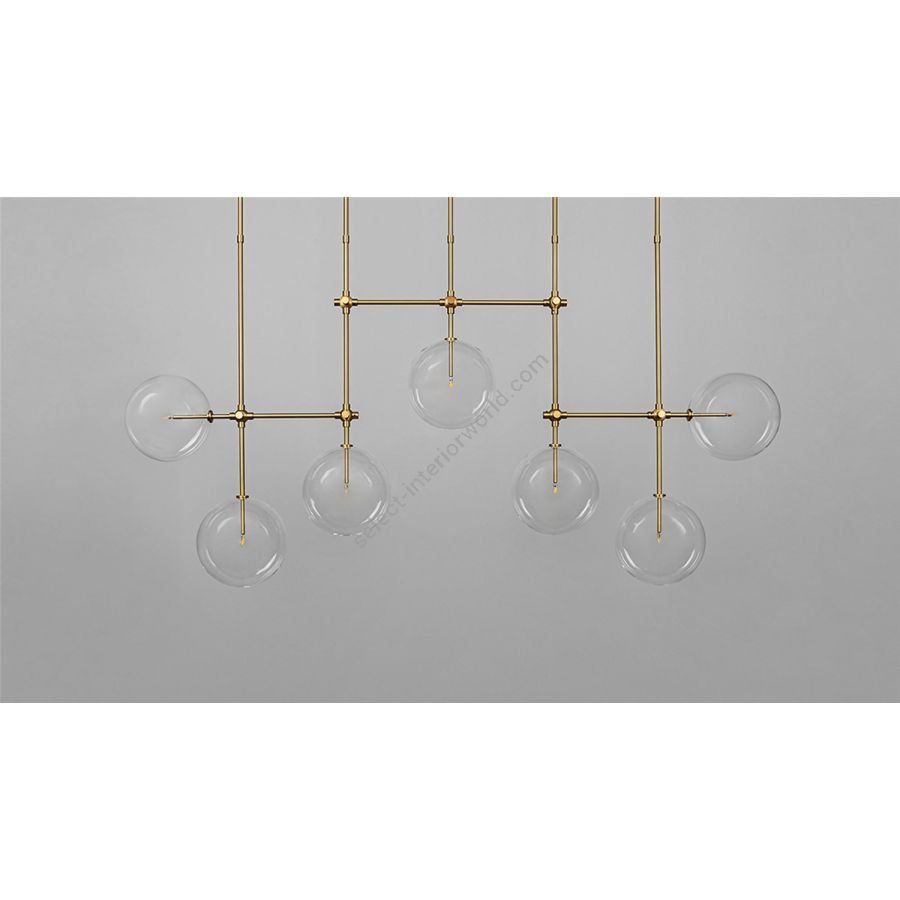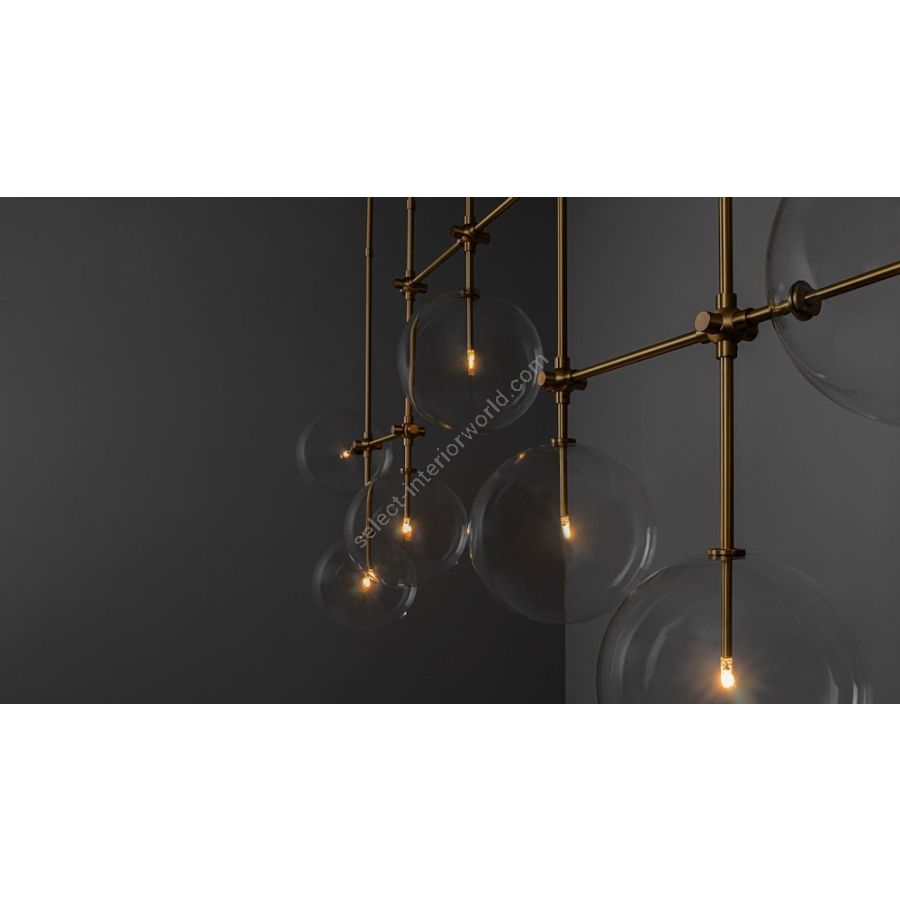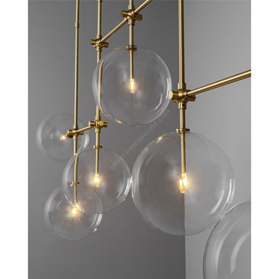 An array of ethereal glass globes floats weightlessly around a geometric lattice. The linear symmetry of the brass grid creates a covalent frame for the sparkling mouth-blown spheres.