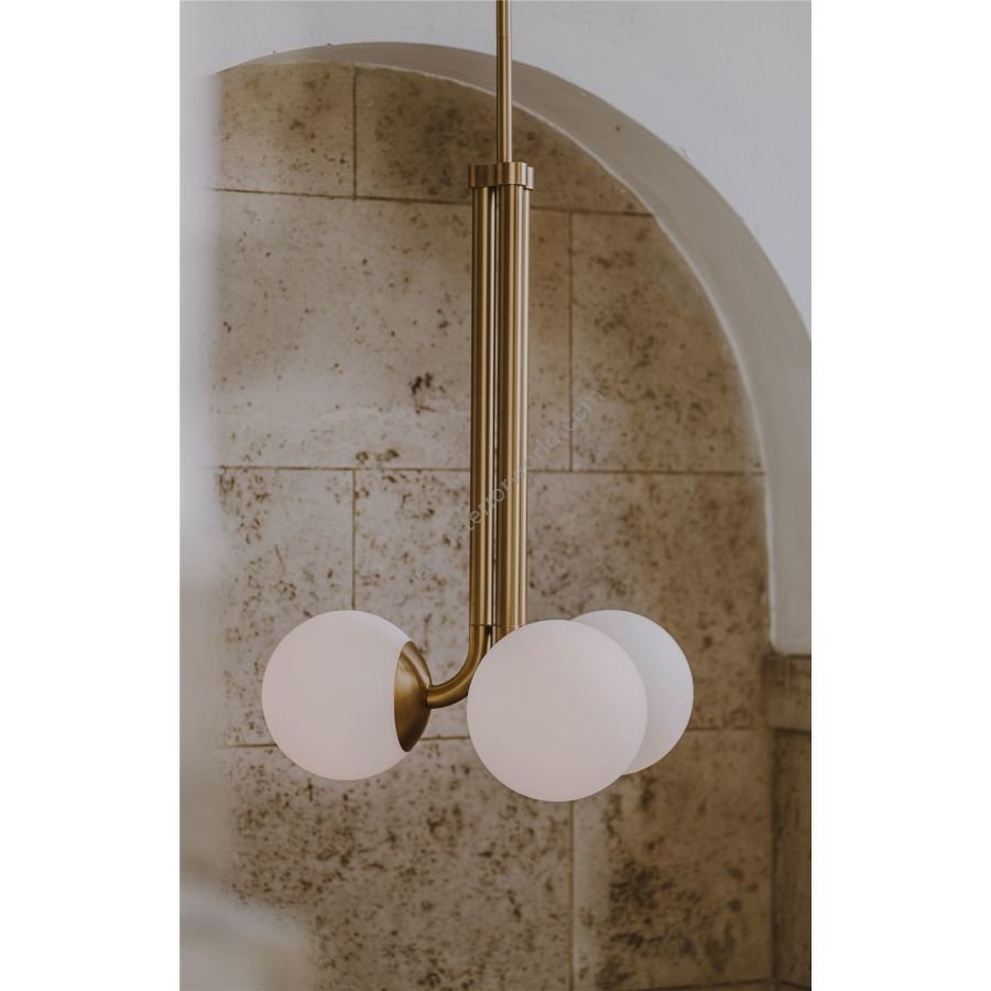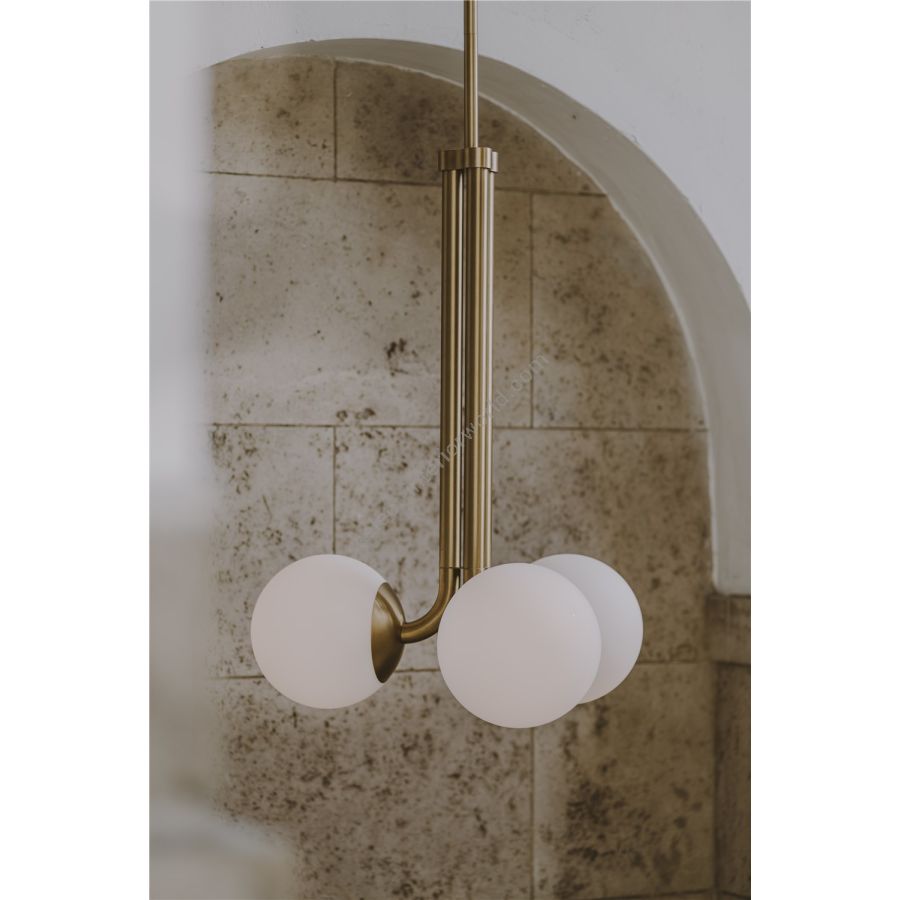 A memory from another new century, an ode to radical simplicity recalling refined Bauhaus style. Deceptively simple, this hovering pendant is clad in opaline glass- three globes project from a triad of brass tubes, emitting a calm and diffuse light.
