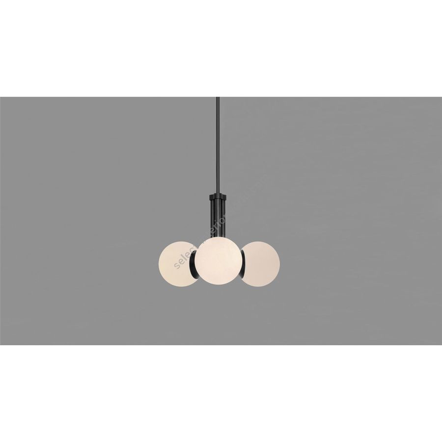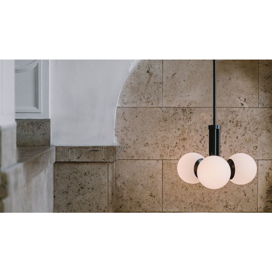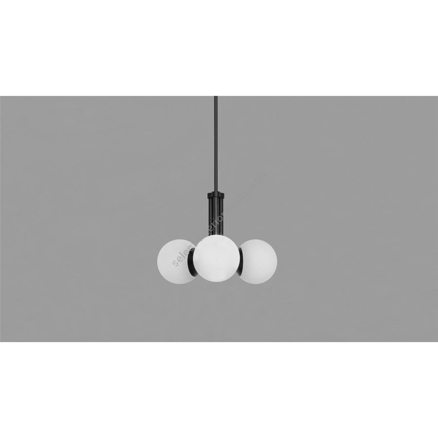 A memory from another new century, an ode to radical simplicity recalling refined Bauhaus style. Deceptively simple, this hovering pendant is clad in opaline glass- three globes project from a triad of brass tubes, emitting a calm and diffuse light.