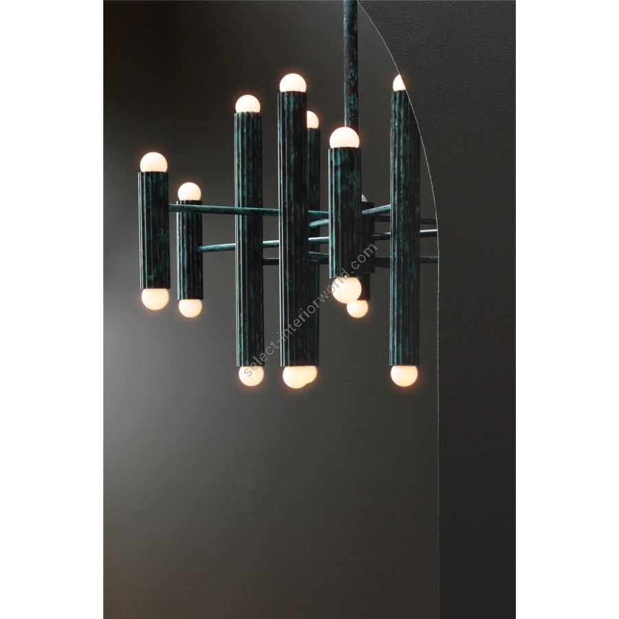 Twelve vertical fluted cylinders from solid brass adorned with bulbs at both extremities, capturing rhythm and structure. Strikingly modern and sculptural, Vesta Round 24 reveals a dynamic interplay of form: from the side, a constellation of light; from below, a singular six-pointed star.