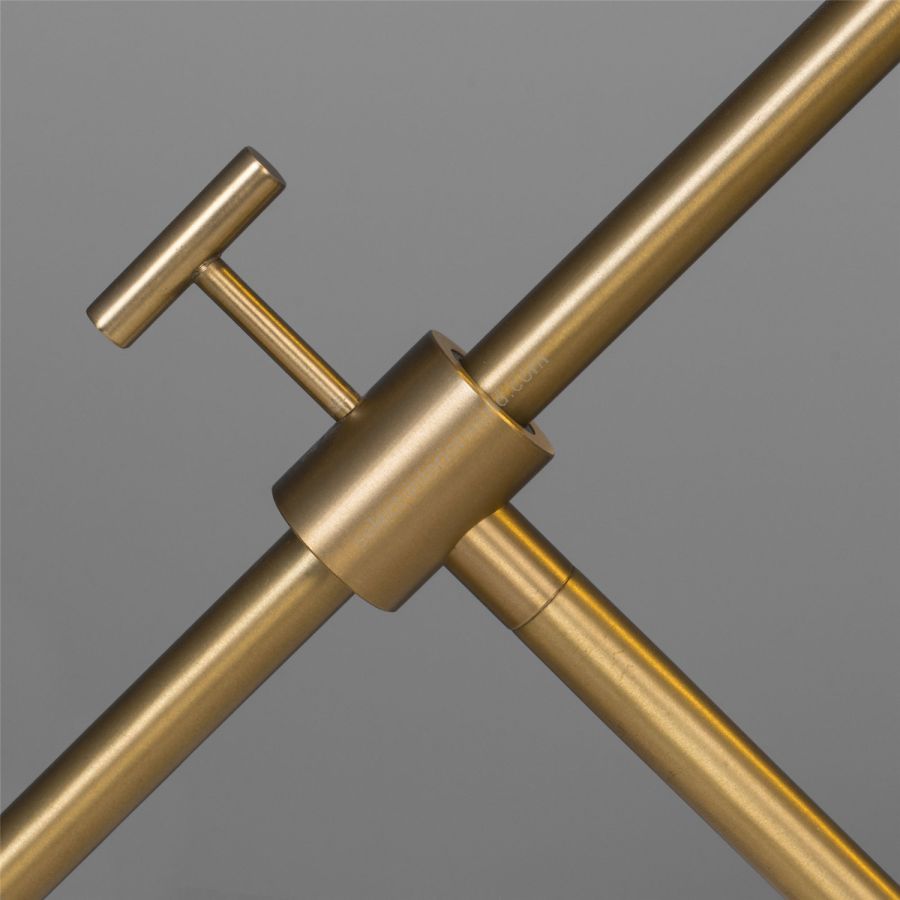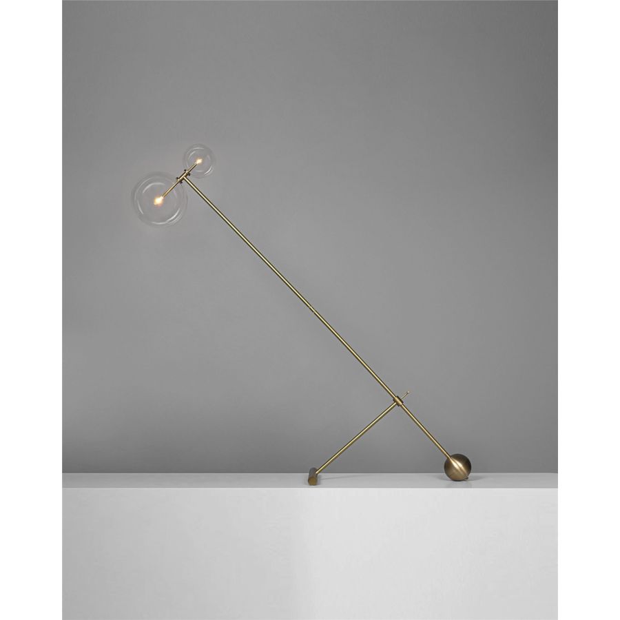 The Zosia floor lamp elevates twin points of light upon thin rods, suspended within orbs of glass. A dynamic counterplay of weight and airiness, two transparent globes float upon a cantilevered brass frame, a brass ball provides the counterweight.