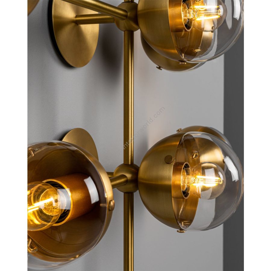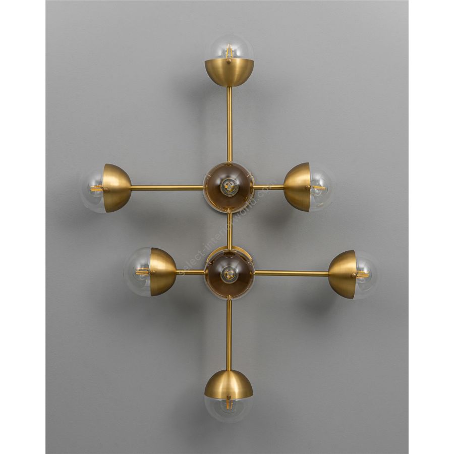 Recalling the basic elements of matter, this wall-mounted molecular model is composed of brass connections. The flush mount base gives this lamp special adaptability, a wall-mounted statement, or a compact chandelier.