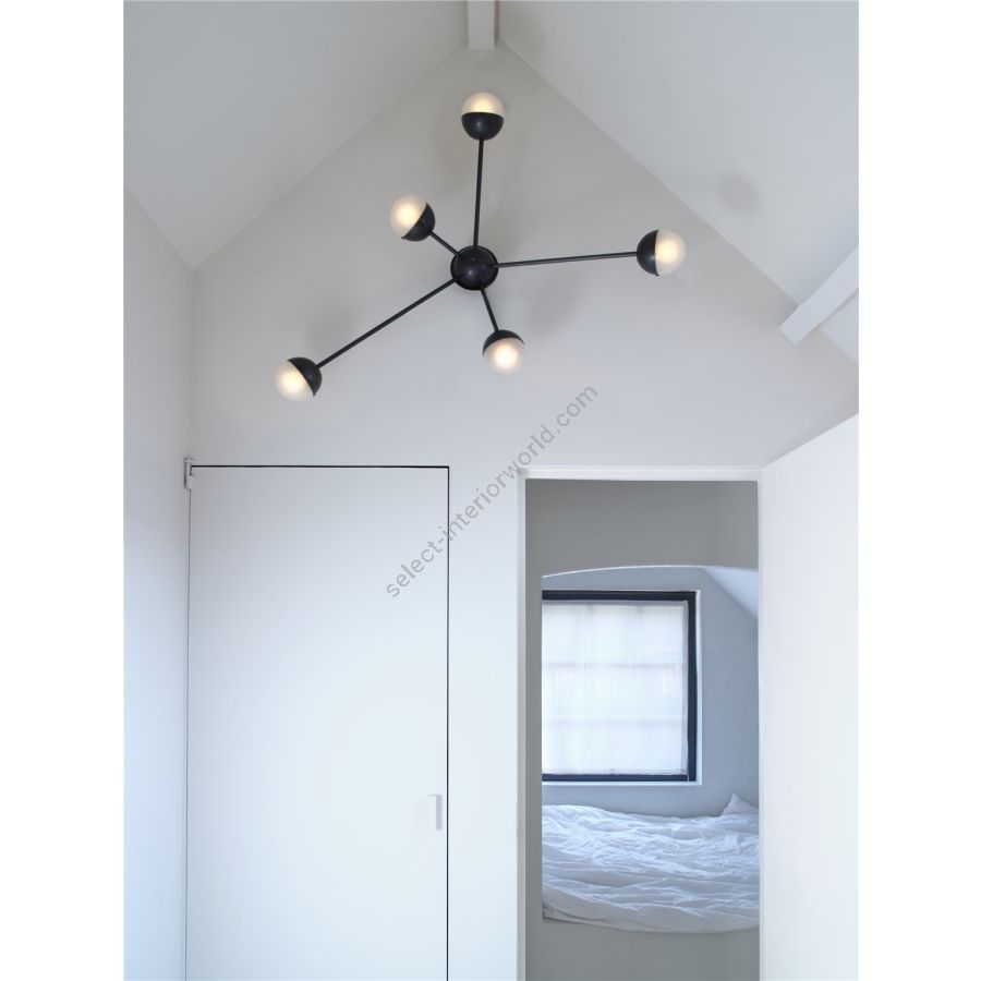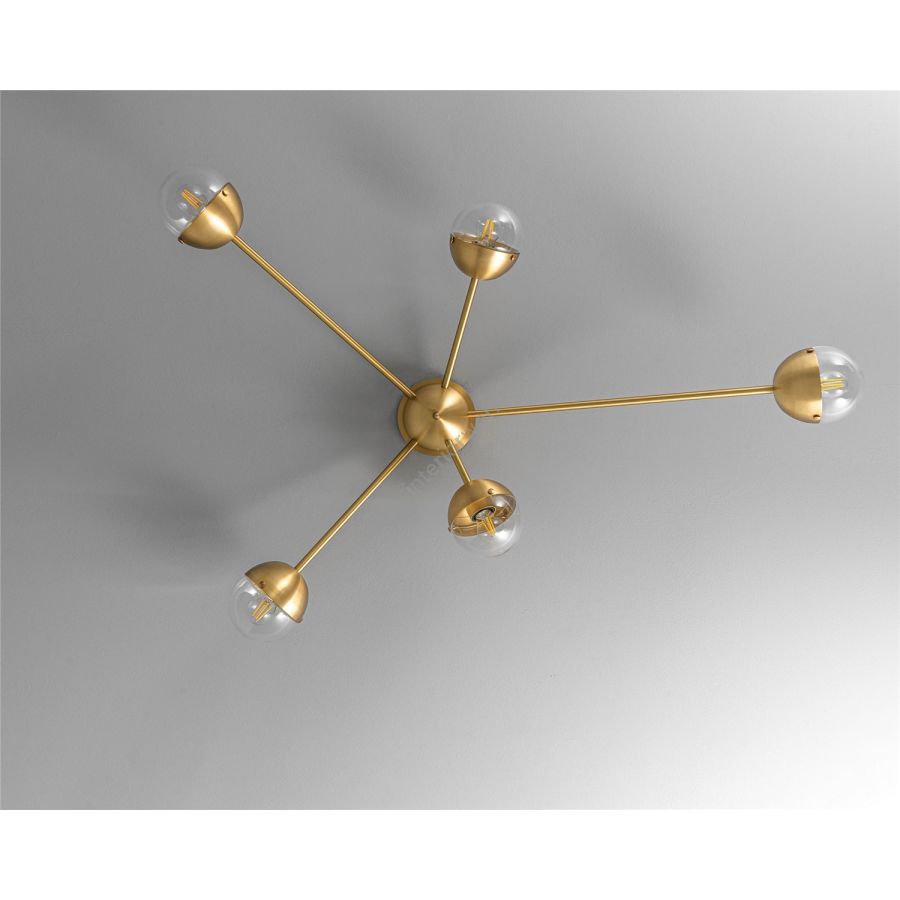 Sparks of light trail brass lines in a circular formation. Radiating out from a spherical nucleus, ten sprightly rods wield illuminated hemispheres, spectacular spatial punctuation. The flush mount base gives this lamp special adaptability, a wall-mounted statement, or a compact chandelier.