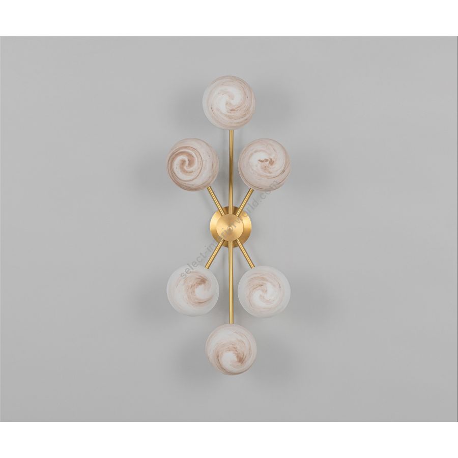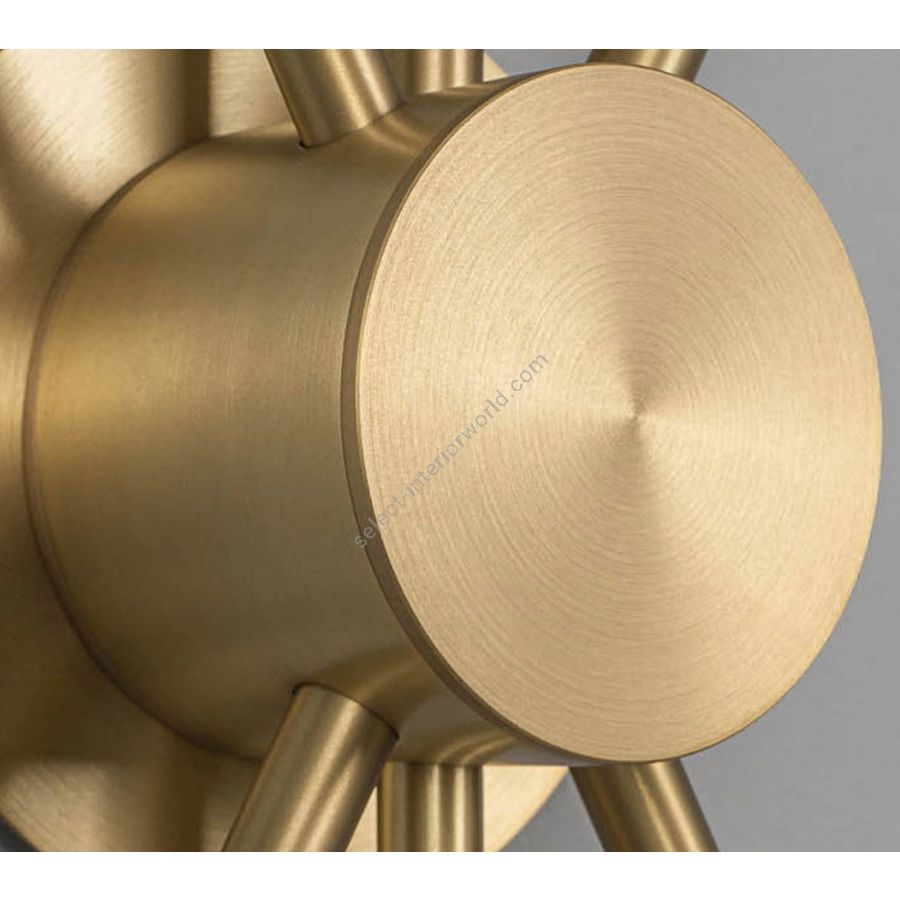 This arrangement of lights explodes into a brass and glass sunburst. A constellation of illuminated globes linked to a central axis creates a space-defining sculptural impression. The flush mount base gives this lamp special adaptability, a wall-mounted statement, or a compact chandelier.